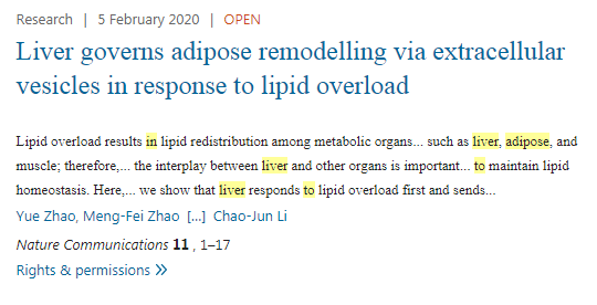 脂質(zhì)超載導(dǎo)致脂質(zhì)在肝臟、脂肪、肌肉等代謝器官間重新分布;因此,肝臟與其他器官之間的相互作用對維持脂質(zhì)內(nèi)環(huán)境穩(wěn)定非常重要。在這里,作者發(fā)現(xiàn)肝臟首先對脂質(zhì)超載做出反應(yīng),并以脂肪細(xì)胞為目標(biāo)發(fā)送肝源性胞外囊泡(EVs) 來調(diào)節(jié)脂肪生成和脂肪生成。肝臟中 Geranylgeranyl 二磷酸合酶(Ggpps) 的表達(dá)因脂質(zhì)超載而增強(qiáng),并通過 Rab27A geranylgerany 調(diào)節(jié) EV 的分泌。一致地,肝臟特異性 Ggpps 缺陷小鼠減少了脂肪沉積。非酒精性脂肪肝(NAFLD) 患者血漿中幾種 EVs 來源的 miRNAs 的水平與體重指數(shù)(BMI) 呈正相關(guān),這些 miRNAs 增強(qiáng)了脂肪細(xì)胞的脂質(zhì)積累。因此,作者強(qiáng)調(diào)了肝臟感知不同代謝狀態(tài)并發(fā)出相應(yīng)信號(hào)的器官間機(jī)制,以重塑脂肪組織,以適應(yīng)脂肪超載引起的代謝變化。