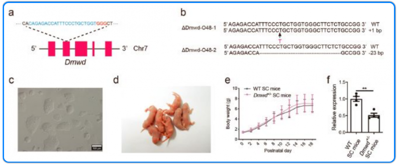 研究人員首先通過半克隆技術(shù)結(jié)合 CRISPR/Cas9 基因編輯技術(shù),成功構(gòu)建了 Dmpk、Six5 和 Mbnl1 雜合突變的孤雄單倍體胚胎干細(xì)胞(AG-haESCs),并通過 ICAHCI 技術(shù)注入卵子進(jìn)而一步獲得 Dmpk、Six5 和 Mbnl1 三基因雜合突變的半克隆小鼠模型。全基因組測序分析結(jié)果顯示沒有脫靶效應(yīng),表型分析顯示該半克隆小鼠產(chǎn)生了肌無力、肌萎縮、嚴(yán)重運(yùn)動(dòng)障礙、呼吸和消化功能紊亂等典型的 DM1 表型,但沒有先天性 DM1(CDM)的表型,提示其他基因的劑量變化可能與此相關(guān)。