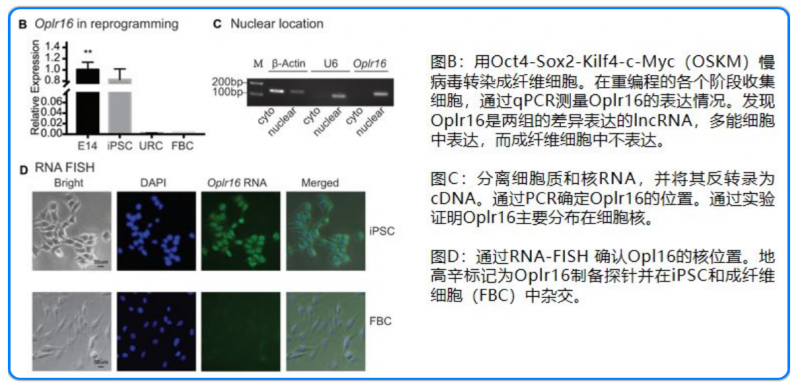 潛在的多能性相關的 lncRNA 應滿足兩個標準能力,首先,具有調(diào)節(jié)干細胞核心因子基因例如 Oct4,Sox2 和 Nanog 的能力。其次,響應多能性狀態(tài)而差異表達。本文作者提出了一種新穎的策略來尋找滿足這兩個標準的潛在 lncRNA。使用染色質(zhì) RNA 原位逆轉(zhuǎn)錄測序(CRIST-seq)方法確定哪些 lncRNA 與 Oct4 啟動子相互作用,然后使用常規(guī)的 RNA 轉(zhuǎn)錄組測序(RNA-seq)來鑒定可能與多能性重編程相關的差異表達的 lncRNA。RNA-seq 用于鑒定在重編程過程中收集的成纖維細胞和 iPSC 之間差異表達的 RNA。進一步鑒定  Oplr16 是多能性相關的 lncRNA。作者分離了細胞質(zhì)和核 RNA 進行亞細胞分級測定。RT-PCR 顯示,Oplr16 主要位于細胞核中(圖 1C)。RNA-FISH 分析也驗證了其在 iPSC 中的核定位(圖 1D)。這些結(jié)果表明 Oplr16 是在體細胞重編程過程中被激活的小鼠核 lncRNA。