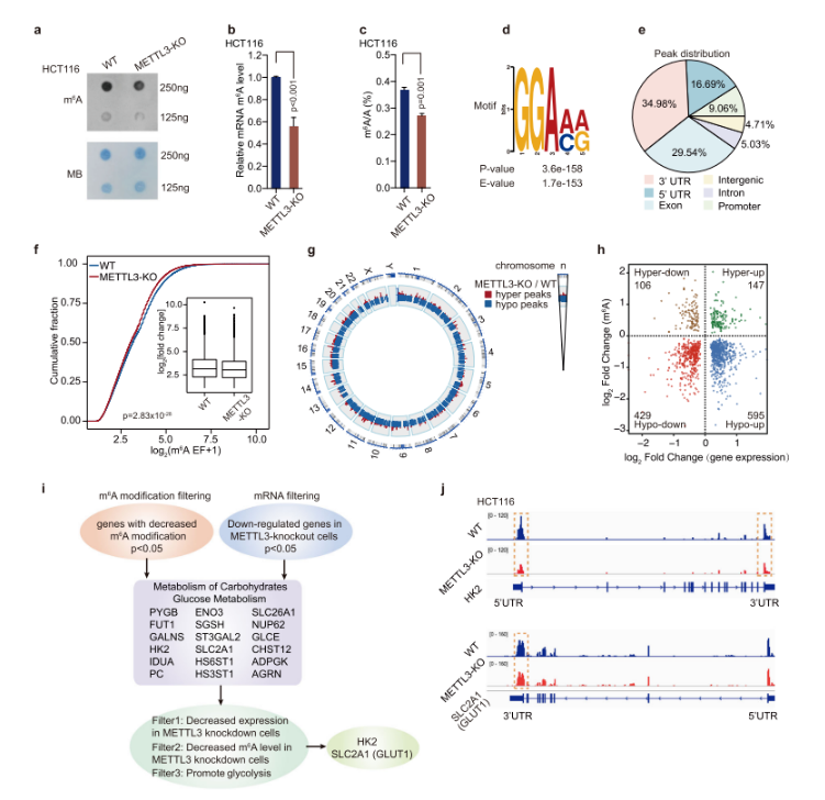 表觀遺傳改變涉及結(jié)腸直腸癌發(fā)生的各個(gè)方面。m6A 調(diào)節(jié)基因的改變?cè)诙喾N人類疾病的發(fā)病機(jī)制中起著重要的作用。然而,這種 mRNA 上的 m6A 修飾是否參與結(jié)直腸癌(CRC) 的糖代謝尚不清楚。采用轉(zhuǎn)錄組測(cè)序和液相色譜 - 串聯(lián)質(zhì)譜法(LC-MS) 評(píng)價(jià) m6A 修飾與 CRC 糖代謝的相關(guān)性。通過質(zhì)譜分析、體內(nèi)外實(shí)驗(yàn)研究 METTL3 對(duì) CRC 糖酵解和腫瘤發(fā)生的影響。采用 m6A-seq 等方法探討 METTL3 在 CRC 中的分子機(jī)制。徐州中心醫(yī)院 CRC 患者 METTL3 和 18F-FDG 攝取之間存在很強(qiáng)的相關(guān)性。在多種 CRC 模型中,METTL3 誘導(dǎo)的 CRC 腫瘤發(fā)生依賴于細(xì)胞糖酵解。機(jī)制上,METTL3 直接與 HK2 的 5 /3 UTR 區(qū)、SLC2A1 (GLUT1) 的 3'UTR 區(qū)相互作用,進(jìn)一步穩(wěn)定這兩個(gè)基因,激活糖酵解途徑。