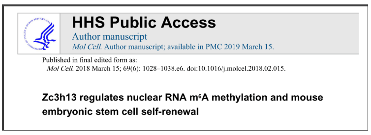 2.Wen J, Lv R, Ma H, et al. Zc3h13 Regulates Nuclear RNA m6A Methylation and Mouse Embryonic Stem Cell Self-Renewal. Mol Cell. 2018;69(6):1028–1038.e6. doi:10.1016/j.molcel.2018.02.015