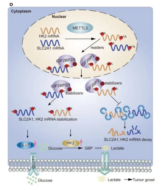 m6A 介導(dǎo)的 HK2 和 SLC2A1 (GLUT1) 的穩(wěn)定分別依賴于 m6A 受體 IGF2BP2 或 IGF2BP2/3。METTL3 是 CRC 的功能性和臨床致癌基因。METTL3 通過 m6A-IGF2BP2/3- 依賴機(jī)制穩(wěn)定 CRC 中 HK2 和 SLC2A1 (GLUT1) 的表達(dá)。靶向 METTL3 及其途徑為高糖代謝的 CRC 患者提供了合理的治療靶點(diǎn)。