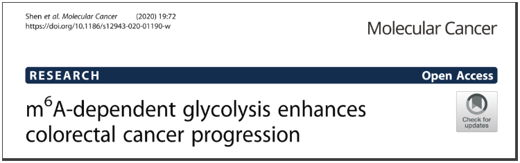 1.Shen C, Xuan B, Yan T, et al. m6A-dependent glycolysis enhances colorectal cancer progression. Mol Cancer. 2020;19(1):72. Published 2020 Apr 3. doi:10.1186/s12943-020-01190-w