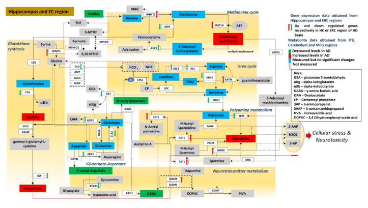 本研究者先前的研究表明了 AD 中的糖酵解、脂肪酸和磷脂代謝的異常,本研究則發(fā)現(xiàn)了研究了轉(zhuǎn)甲基化途徑(一碳單位的主要代謝來源)和密切相關(guān)的多胺合成 / 分解代謝途徑的失調(diào)與 AD 的發(fā)病相關(guān)。包括神經(jīng)遞質(zhì)信號、尿素循環(huán)、天冬氨酸類谷氨酸代謝和谷胱甘肽合成的異常。(研究者將 ITG 組差異的主要結(jié)果在特定的生化途徑中)