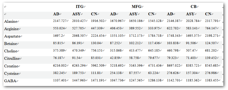 5. 谷氨酸 - 天冬氨酸代謝    在 ITG 中,AD 中的 NAA (P=0.002*) 濃度較低。與 CN 相比,AD 的 FH,MDH1,MDH2,GLS2 和 GOT2 基因在海馬 / ERC 中的表達降低。