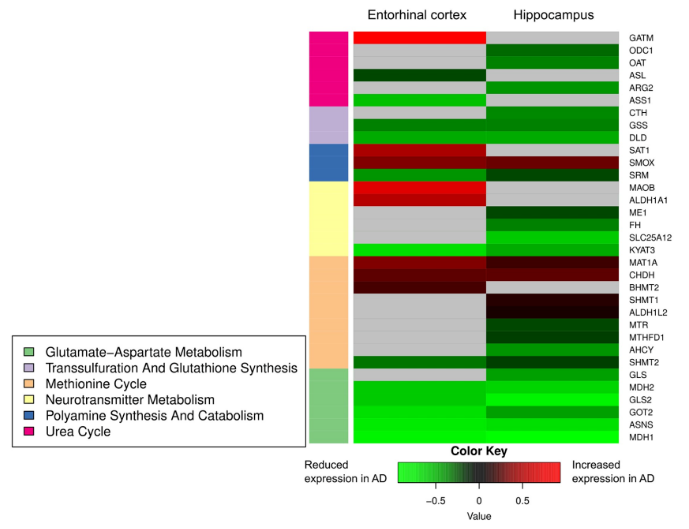 甲基化和多胺途徑相關(guān)的生化反應的六個類別中的 33 個基因(FDR 校正的 p 值 <0.05)中,AD 和 CN 的 ERC /HIP 區(qū)域的基因表達水平發(fā)生了變化。使用 FDR 校正多次后,AD 和 CN 樣品之間基因表達的這些差異具有統(tǒng)計學意義,與 CN 相比,圖 4 總結(jié)了 AD 患者的 HIP/ERC 中與轉(zhuǎn)甲基化和多胺代謝相關(guān)的所有六類生化反應的差異表達基因?;疑硎?AD 患者和對照組的基因表達沒有顯著差異。