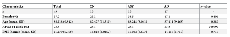 研究者采用 R -Studio1.1.453 和 STATA16.0 軟件進行分析。使用 α 值 0.05 來確定統(tǒng)計學意義。同時進行了多重比較方法 Benjamini-Hochberg 錯誤發(fā)現(xiàn)率(FDR=0.05)和 bonferoni 校正(FWER=0.05)。兩種比較方法均校正了 52 種比較(26 種代謝物×2 個主要腦部區(qū)域 ITG 和 MFG),這些比較是基于它們對不同 AD 病理的易感性而預先指定的。檢查了三組(AD,ASY 和 CN)在性別,APOEε4 攜帶者狀態(tài)(Fisherexact 試驗),年齡和驗尸間隔(PMI)(Kruskal-Wallis 測試)方面的差異樣。信息如表 2: