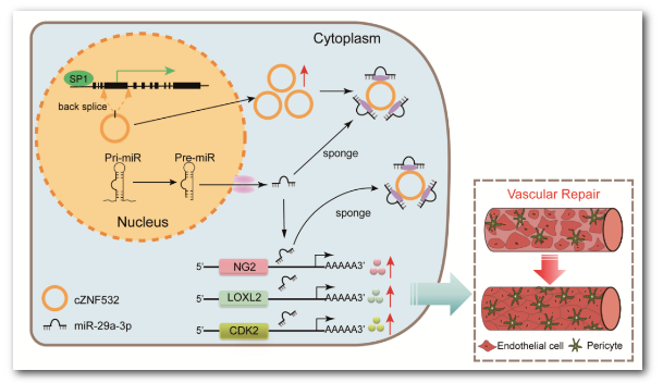 摘要: 糖尿病視網(wǎng)膜病(DR)是工作年齡成人視力喪失的主要原因。血管周細(xì)胞變性是 DR 的主要臨床表現(xiàn),但對周細(xì)胞變性的機(jī)制了解甚少。環(huán)狀 RNA(circRNA)在多種生物學(xué)過程和疾病進(jìn)展中起重要作用。該研究中,研究者調(diào)查了 circRNA 在周細(xì)胞生物學(xué)和糖尿病引起的視網(wǎng)膜血管功能障礙中的作用。在糖尿病應(yīng)激下的周細(xì)胞中,糖尿病鼠模型的視網(wǎng)膜血管中以及糖尿病患者的玻璃體液中,cZNF532 的表達(dá)上調(diào)。cZNF532 沉默可降低周細(xì)胞的活力,增殖和分化,并抑制周細(xì)胞向內(nèi)皮細(xì)胞募集。cZNF532 通過充當(dāng) miR-29a-3p 海綿并誘導(dǎo) NG2,LOXL2 和 CDK2 的表達(dá)增加,進(jìn)而調(diào)節(jié)周細(xì)胞生物學(xué)功能。降低 cZNF532 或 miR-29a-3p 的表達(dá)加劇了鏈脲佐菌素誘導(dǎo)的視網(wǎng)膜周細(xì)胞變性和血管功能障礙。相比之下,cZNF532 的過表達(dá)或 miR-29a-3p 的抑制可改善人糖尿病性視網(wǎng)膜病變引起的玻璃體和視網(wǎng)膜周細(xì)胞變性和血管功能障礙。該研究結(jié)果數(shù)據(jù)確定了 circRNA 介導(dǎo)的機(jī)制,可協(xié)調(diào) DR 中的周細(xì)胞生物學(xué)和血管穩(wěn)態(tài)。誘導(dǎo) cZNF532 或抑制 miR-29a-3p 是治療 DR 的一種可利用的治療方法。