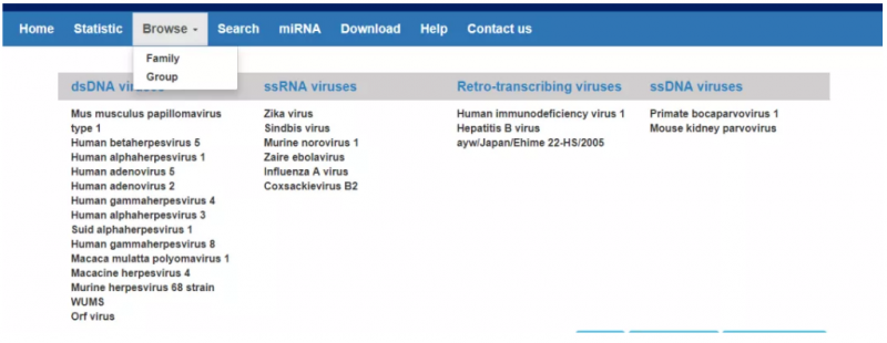 在數(shù)據(jù)庫中可以通過 browse 來進行 circRNA 的搜索,包括可以在病毒所屬的 family 層面和病毒核酸類型(group)來進行搜索。