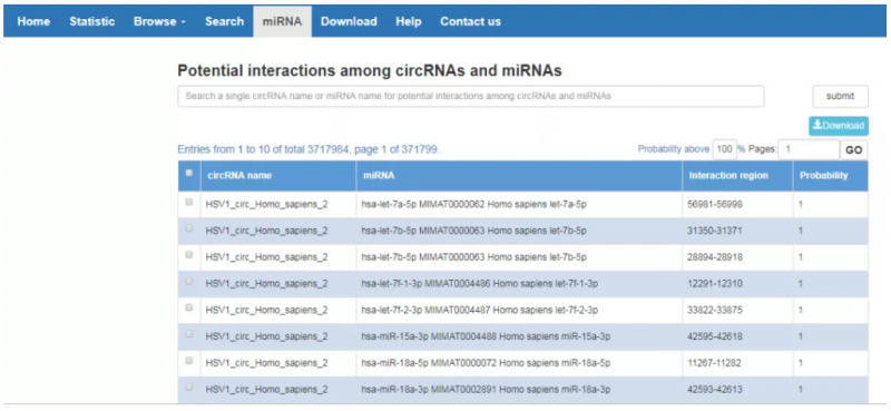 據(jù)報道,多種病毒 circRNA 在癌癥的進展中起重要作用。例如,人乳頭瘤病毒中的病毒 circRNA E7 (CircE7) 被 m6A 修飾,編碼 E7 蛋白,可以調(diào)控癌細(xì)胞的增殖。同時 circRNA 可以作為 miRNA 的吸附海綿,來調(diào)控 mRNA 的表達,進而影響疾病的發(fā)生發(fā)展。那么病毒產(chǎn)生的 circRNA 是否可以通過吸附宿主的 miRNA,進而來調(diào)控宿主的基因表達呢?該數(shù)據(jù)庫也提供了病毒 circRNA 和宿主 miRNA 結(jié)合的數(shù)據(jù),包括病毒 circRNA name,宿主 miRNA name 以及兩者的結(jié)合位點,及預(yù)測的可能性(%)。