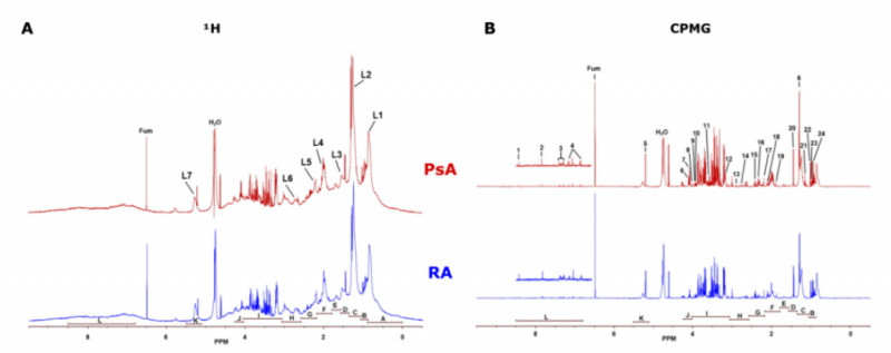 類風濕性關(guān)節(jié)炎(RA) 的診斷主要基于臨床癥狀和類風濕因子(RF),抗瓜氨酸肽抗體(抗 CCP) 的血清學陽性,而銀屑病關(guān)節(jié)炎(PsA) 只有臨床和影像學特征有助于診斷。雖然大多數(shù) RA 患者 RF,抗 CCP 血清陽性,但約 15%-20% 的 RA 病例中,血清中 RF 和抗 CCP 水平并未升高,由于血清陰性 RA(negRA) 和 PsA 的癥狀非常相似,且沒有可靠的臨床標志物,因此  , 兩者的鑒別診斷十分困難。由于治療方法不同,可靠的診斷對于開出正確的治療處方很重要。此外,導致 RA 和 PsA 患者特征性關(guān)節(jié)破壞的慢性炎癥過程可能會引起細胞、組織和器官代謝的重大和不同程度的改變。這些代謝改變導致血清代謝物和脂質(zhì)體的改變。因此研究者對 negRA 和 PsA 患者血清進行了基于 1H NMR 的代謝組學和脂質(zhì)組學分析,識別 negRA 和 PsA 患者血清中濃度不同的代謝物和脂類。從這些數(shù)據(jù)中推導出一個模型,將患者分類為兩種疾病類別中的一種,隨后進行了盲法驗證隊列分析,確定生物標志物來提高這些疾病的鑒別診斷。