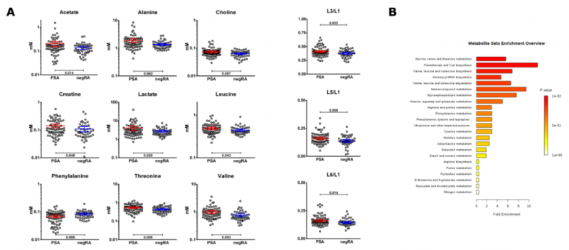 Margarida souto-carneiro,lilla Tóth,rouven Behnisch,et al. Differences in the serum metabolome and lipidome identify potential biomarkers for seronegative rheumatoid arthritis versus psoriatic arthritis. Ann Rheum Dis.2020; 79(4):499-506.