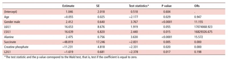 通過逐步向前 - 向后選擇算法,以下診斷預(yù)測因子已包括在診斷模型中:年齡,性別,L6 / L1,L5 / L1,L2 / L1,丙氨酸,琥珀酸和磷酸肌酸。