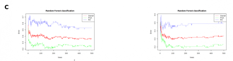 單一代謝物或脂質(zhì)比例的  ROC 分析得到的曲線下面積(AUC) 小 70%。因此,單變量模型對 PsA 和 negRA 患者的鑒別的敏感性和特異性低。為了達到高的診斷準確率,研究者建立了三種不同的機器學習算法:隨機森林算法、樸素貝葉斯算法和多元 Logistic 回歸算法,對 73 例 PsA 和 49 例 negRA 患者的代謝組和脂質(zhì)組進行了分析。隨機森林預(yù)測 PsA 的準確率 73.3%(Cohen‘s kappa 40.1%),樸素貝葉斯準確率為 63.7%(Cohen’s kappa 26.5%)。